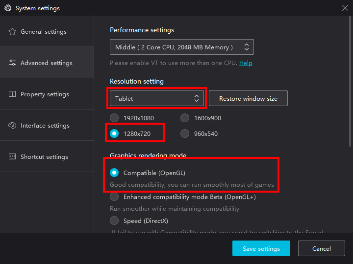 - В расширенных настройках нужно выставить: Планшет, разрешение 1280x720